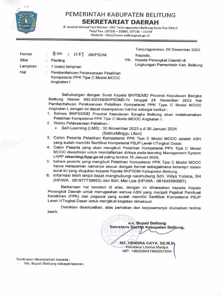 Belitung Nomor 893.8/2159/BKPSDMD-IV tanggal 28 November 2023 Hal