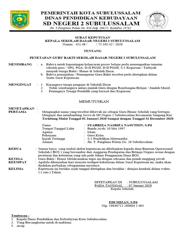 PENETAPAN GURU BAKTI SEKOLAH DASAR NEGERI 2 SUBULUSSALAM
