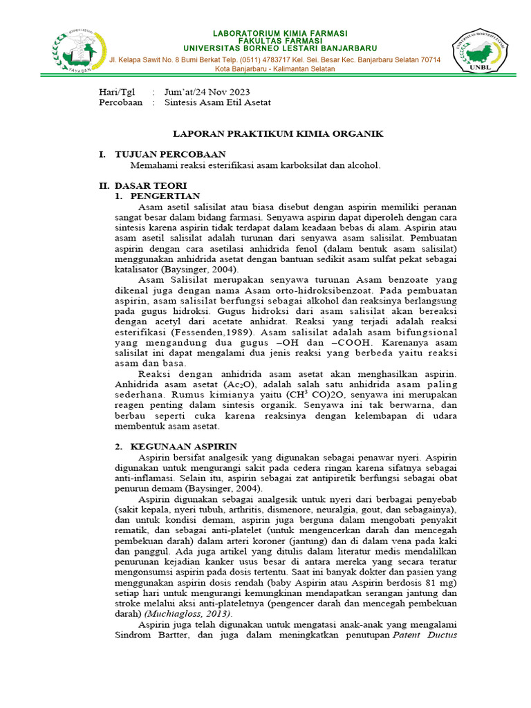 percobaan sintesis senyawa aspirin atau asam asetil salisilat. Aspirin sendiri