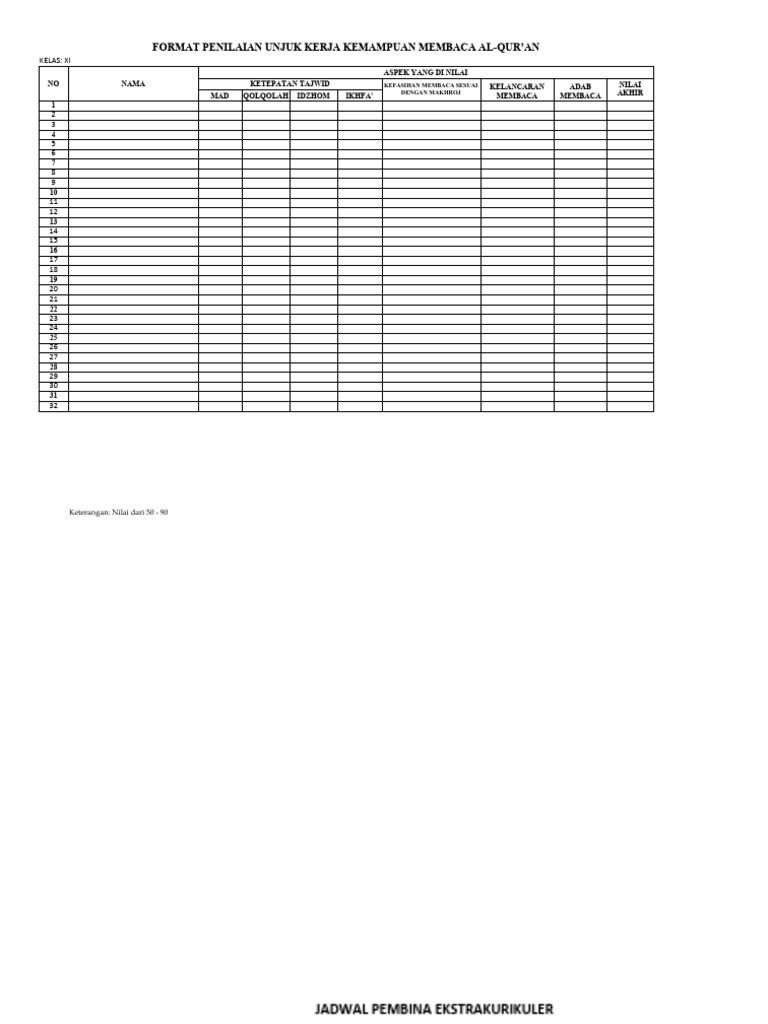 NO NAMA KETEPATAN TAJWID KEFASIHAN MEMBACA SESUAI KELANCARAN ADAB NILAI