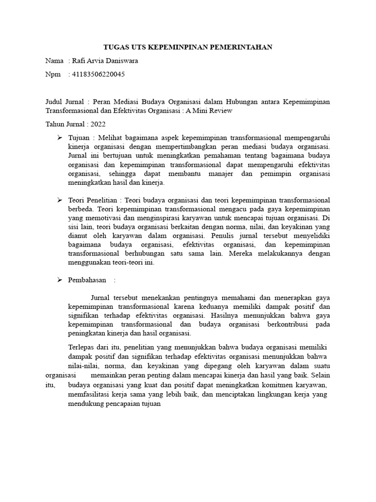 Judul Jurnal : Peran Mediasi Budaya Organisasi dalam Hubungan antara Kepemimpinan