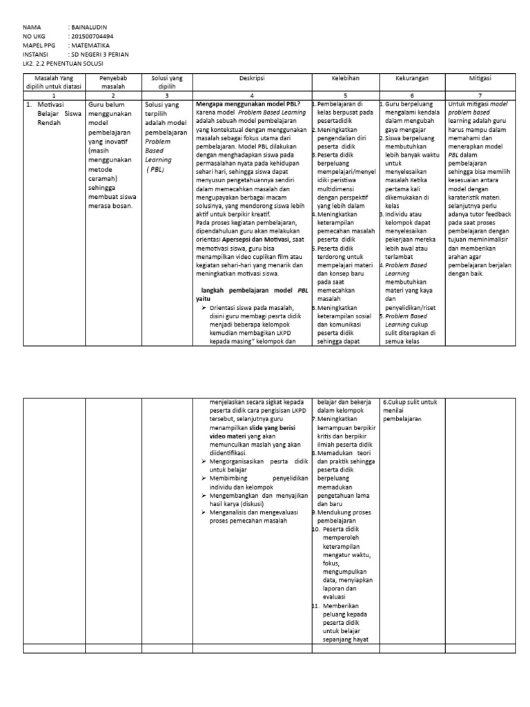 1. Motivasi Guru belum Solusi yang Mengapa menggunakan model PBL? 1.Pembelajaran di 1. Guru berpeluang Untuk mitigasi model
