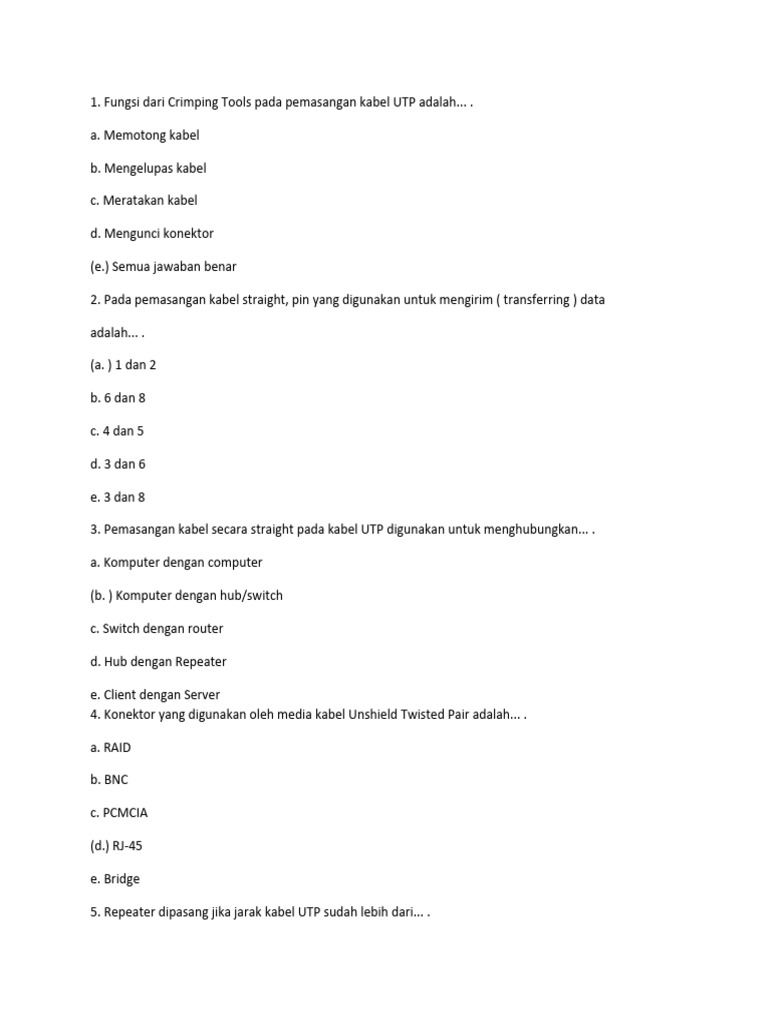 1. Fungsi dari Crimping Tools pada pemasangan kabel UTP adalah... .
