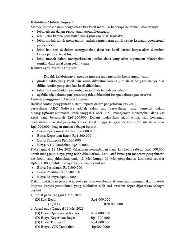 1. Metode imprest yaitu metode pengendalian kas kecil dimana rekening kas kecil
