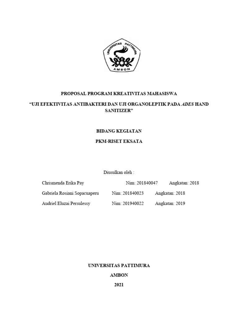 “Uji Efektivitas Antibakteri dan Uji Organoleptik Pada Ades Hand Sanitizer” yang diusulkan