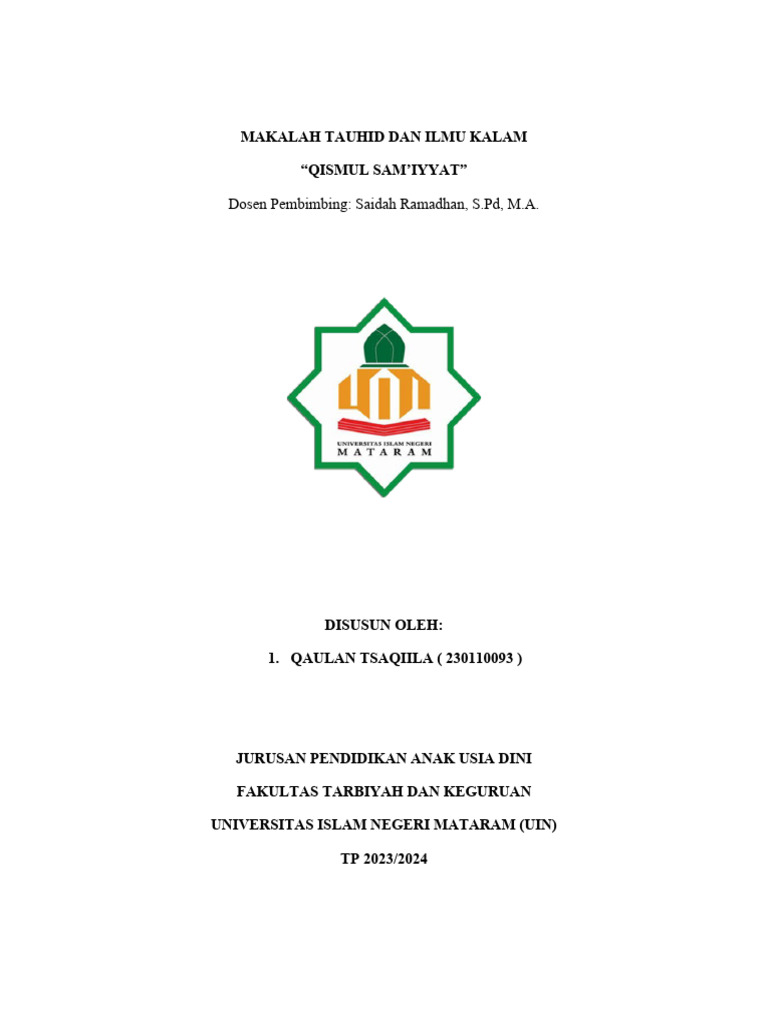 dapat menyelesaikan makalah yang berjudul ”QISMUL SAM’IYYAT ”. Tujuan dari