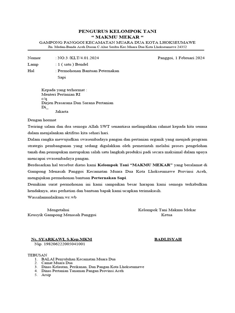 Tanggal 1 Februari 2024, Perihal Permohonan Bantuan Peternakan Sapi yang