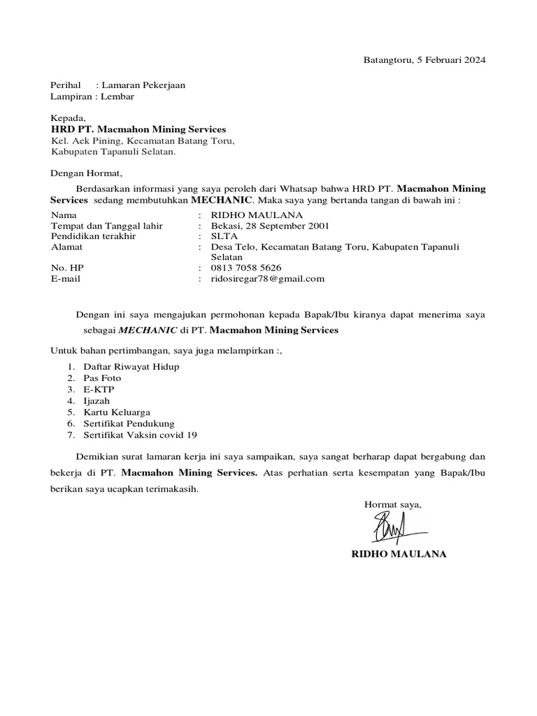 bekerja di PT. Macmahon Mining Services. Atas perhatian serta kesempatan yang Bapak/Ibu