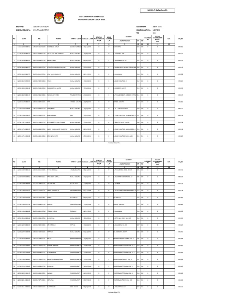 Perempuan: 164 B : Belum Kawin 2 : Disabilitas Intelektual S : Sudah memiliki KTP-el 1 : Meninggal 7 : Polri KOMISI PEMILIHAN UMUM KOTA PALANGKARAYA