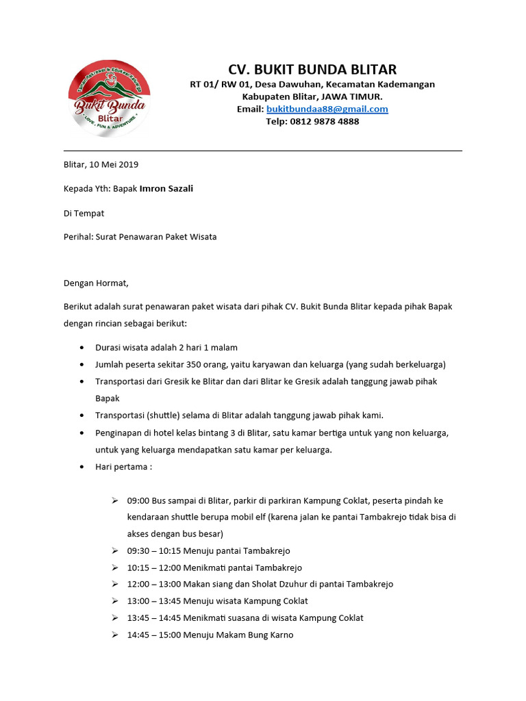 Berikut adalah surat penawaran paket wisata dari pihak CV. Bukit Bunda Blitar kepada pihak Bapak