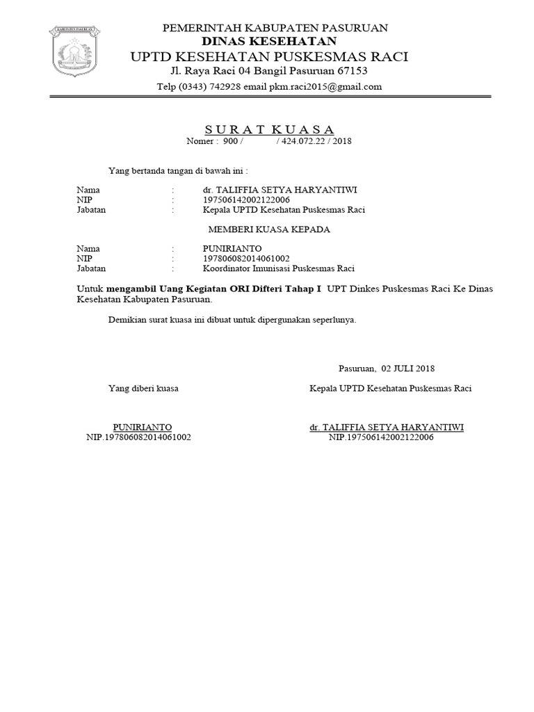 Yang diberi kuasa Kepala UPTD Kesehatan Puskesmas Raci