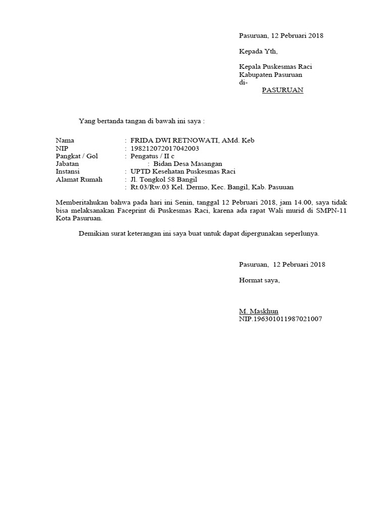 Memberitahukan bahwa pada hari ini Senin tanggal 12 Pebruari 2018, saya mohon ijin tidak