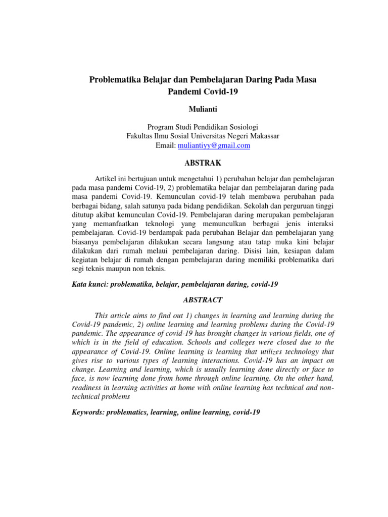 Kata kunci: problematika, belajar, pembelajaran daring, covid-19