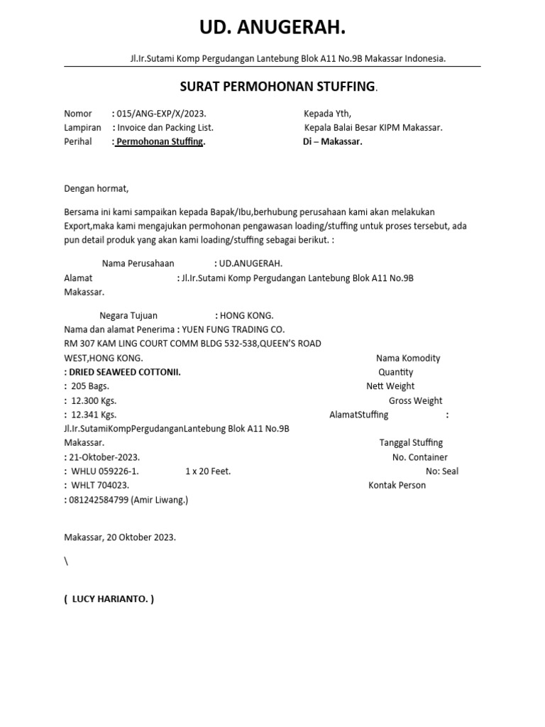 Perihal : Permohonan Stuffing. Di – Makassar.