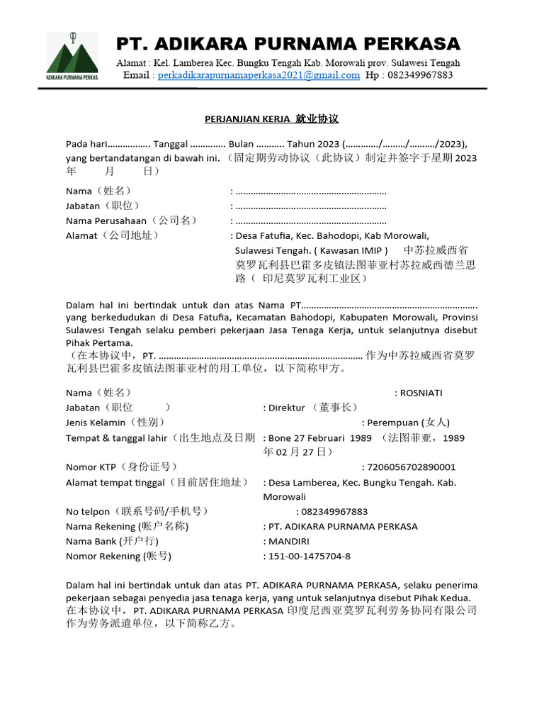 PERJANJIAN KERJA 就业协议