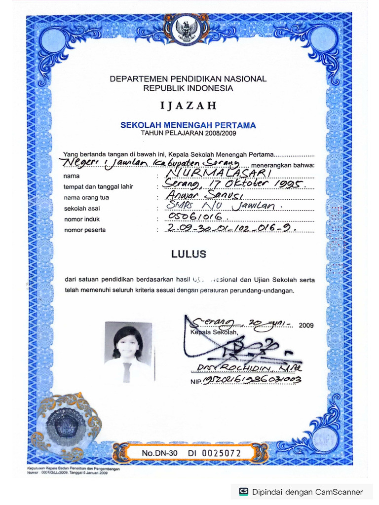 Contoh Ijazah SMP Tahun 2001