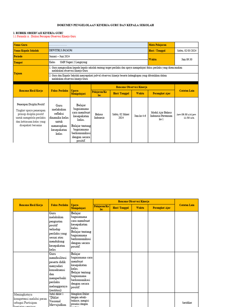 2. Guru dan Kepala Sekolah menyepakati jadwal observasi kinerja beserta kelengkapan yang dibutuhkan dalam