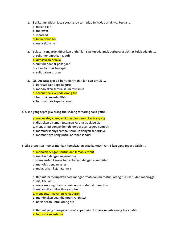 7. Berikut yang merupakan contoh perilaku durhaka kepada orang tua adalah ....