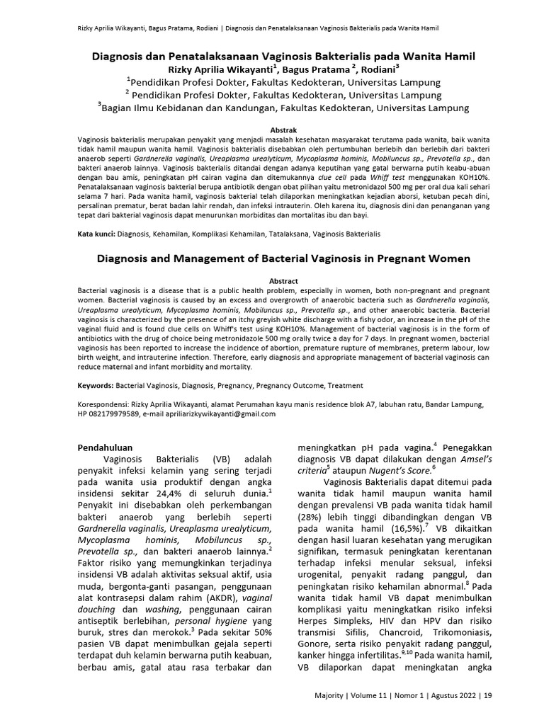 Rizky Aprilia Wikayanti, Bagus Pratama, Rodiani | Diagnosis dan Penatalaksanaan Vaginosis Bakterialis pada Wanita Hamil