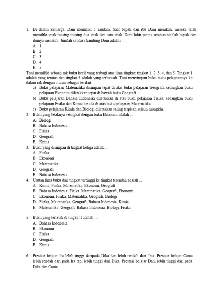 6. Prestasi belajar Ira lebih tinggi daripada Dika dan lebih rendah dari Tita. Prestasi belajar Cania