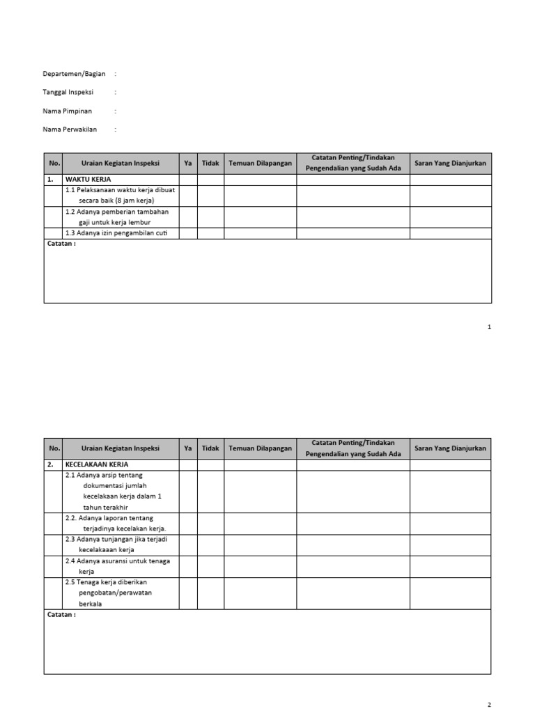 No. Uraian Kegiatan Inspeksi Ya Tidak Temuan Dilapangan Saran Yang Dianjurkan