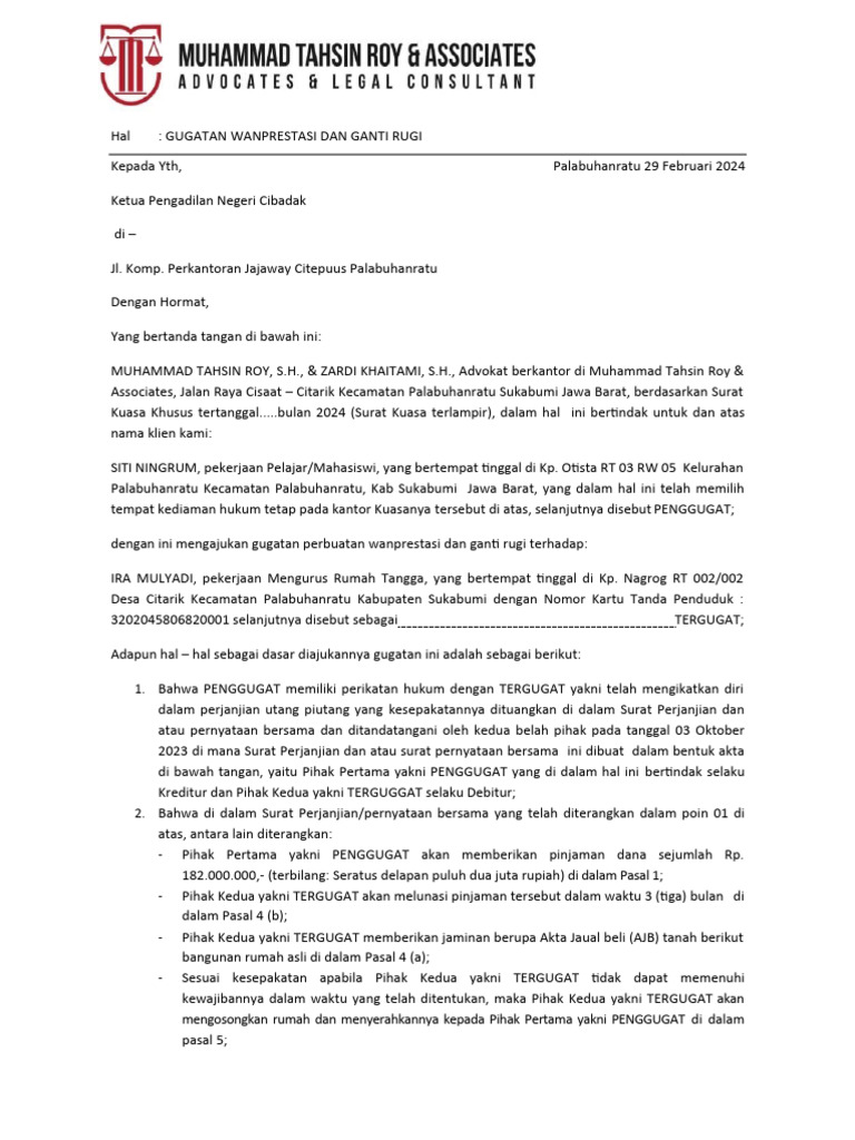dengan ini mengajukan gugatan perbuatan wanprestasi dan ganti rugi terhadap: