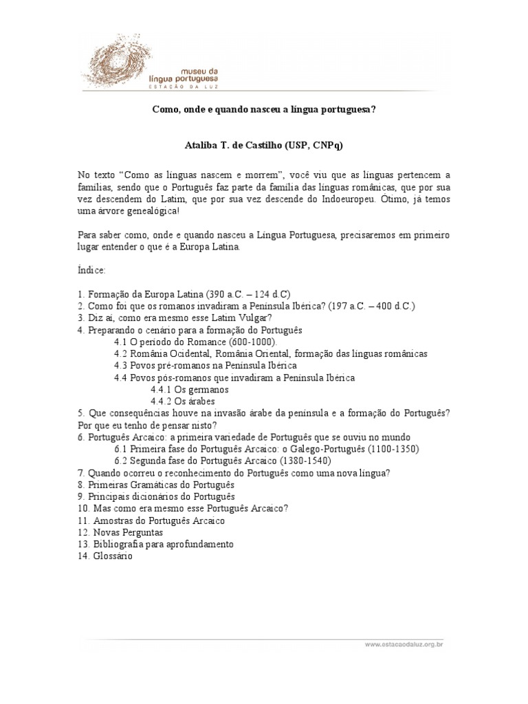 12. Novas perguntas Que fao para saber se meu nome pr-romano, romano ou ps-romano, supondo-se que ele tenha uma dessas derivaes? As palavras que herdamos dos povos no-latinos so vitais em nosso dia-a-dia? Os Cruzados agiram isoladamente na retomada das terras ibricas aos rabes, ou eles se integrariam em alguma organizao maior? Os textos medievais s vezes so difceis de entender. Que devo fazer para facilitar minha leitura deles? Que importncia isso tem? 13. Bibliografia para aprofundamento 2. Sobre a Ibria romana, ler Baldinger (1962). 3. Sobre o Latim Vulgar, veja Silva Neto (1950), Maurer Jr. (1959), Ilari (2004).