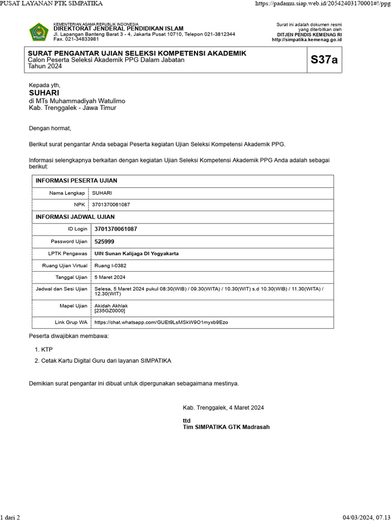 Berikut surat pengantar Anda sebagai Peserta kegiatan Ujian Seleksi Kompetensi Akademik PPG.