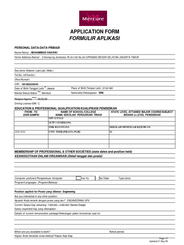 Position applied for/Posisi yang dilamar : Engineering
