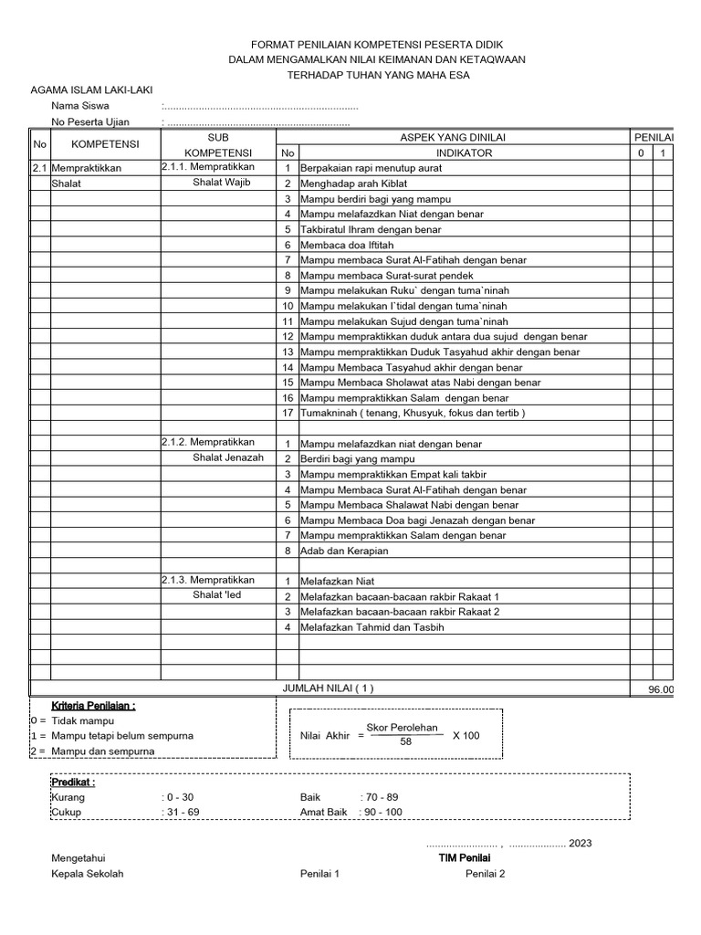 1 = Mampu tetapi belum sempurna Nilai Akhir = X 100