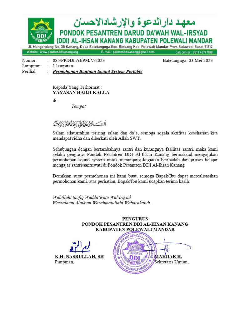 selaku pengurus Pondok Pesantren DDI Al-Ihsan Kanang bermaksud mengajukan