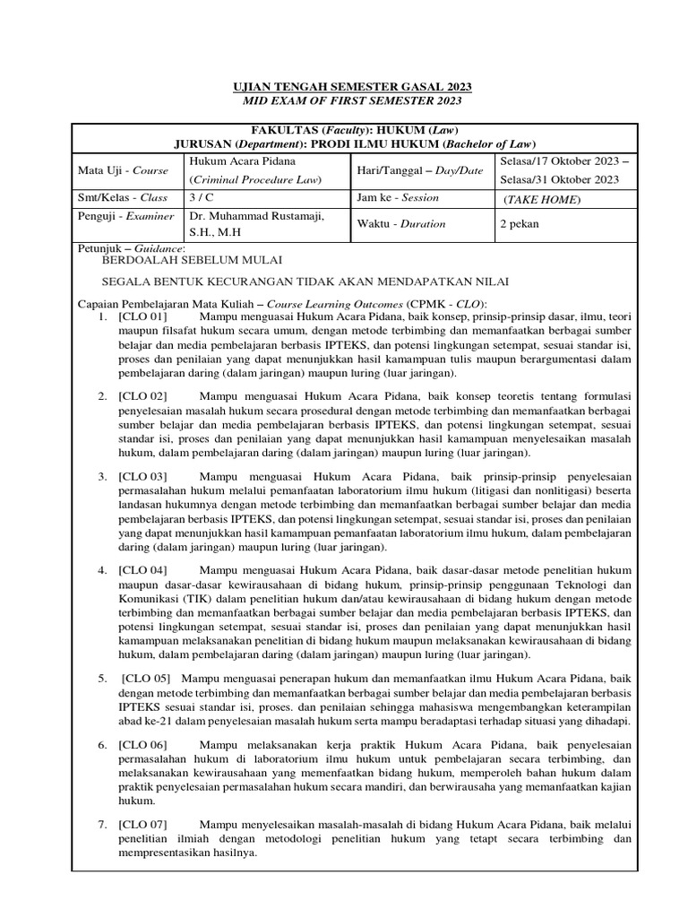 7. [CLO 07] Mampu menyelesaikan masalah-masalah di bidang Hukum Acara Pidana, baik melalui