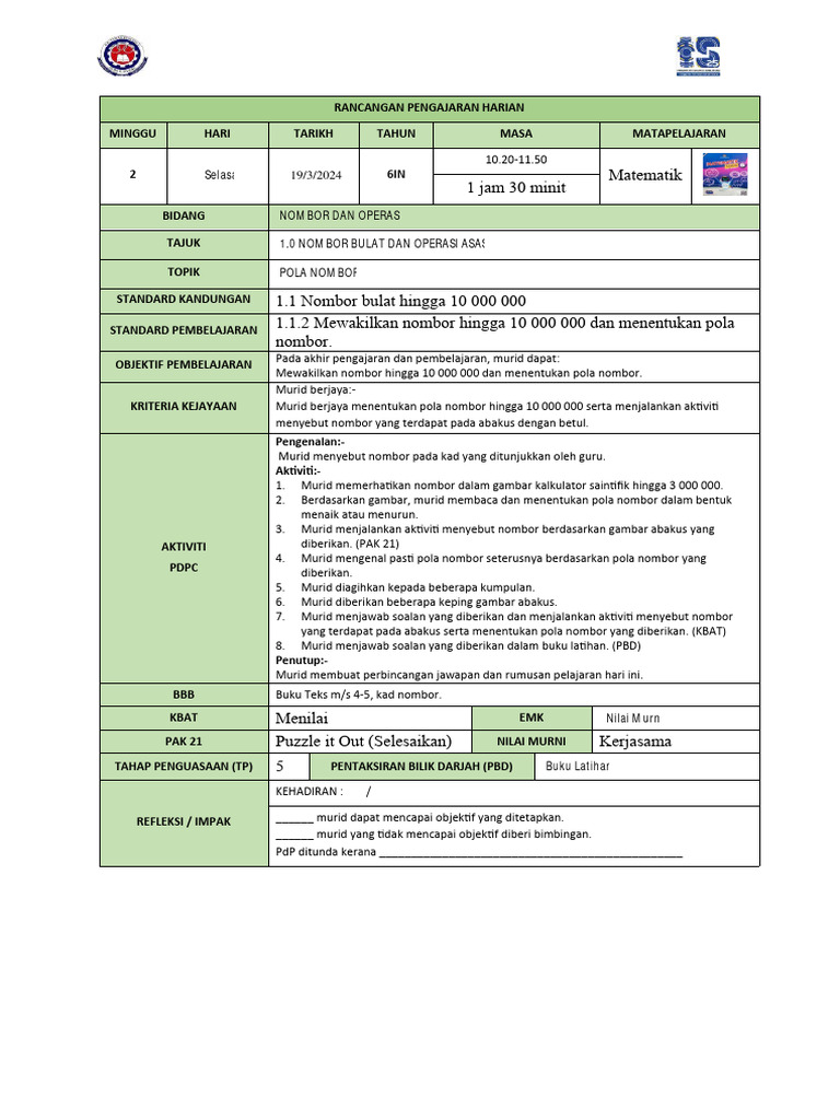 KRITERIA KEJAYAAN Murid berjaya menentukan pola nombor hingga 10 000 000 serta menjalankan aktiviti
