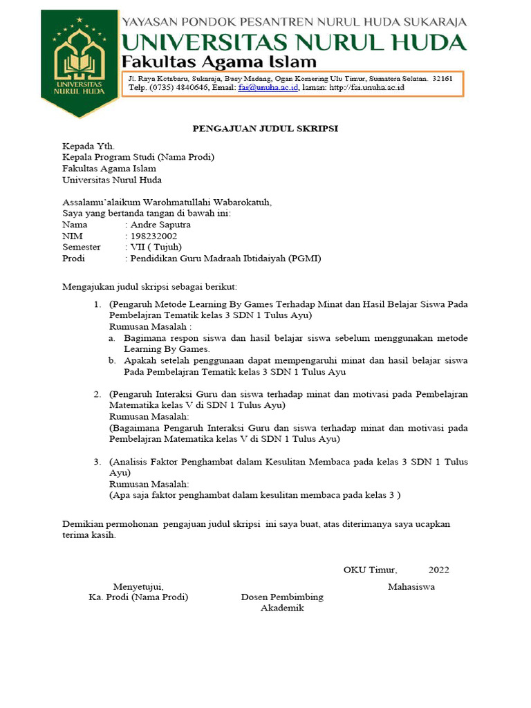 Demikian permohonan pengajuan judul skripsi ini saya buat, atas diterimanya saya ucapkan