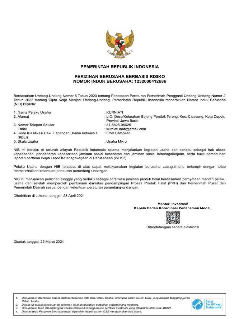 Pelaku Usaha dengan NIB tersebut di atas dapat melaksanakan kegiatan berusaha sebagaimana terlampir dengan tetap