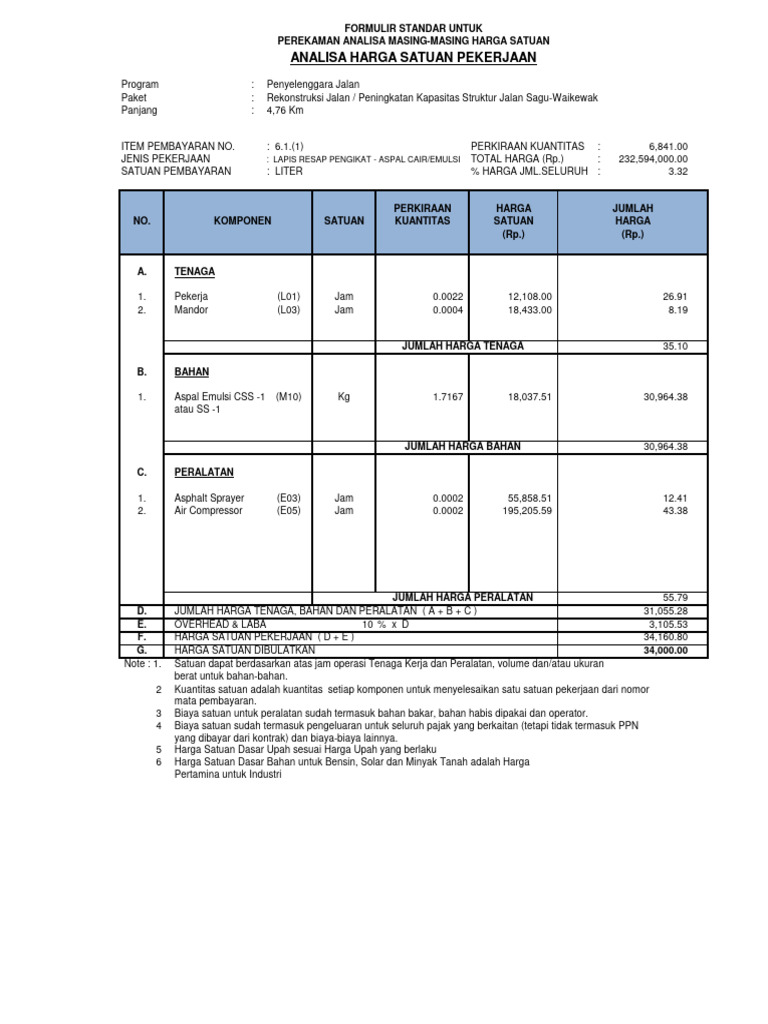 SATUAN PEMBAYARAN : LITER URAIAN ANALISA HARGA SATUAN