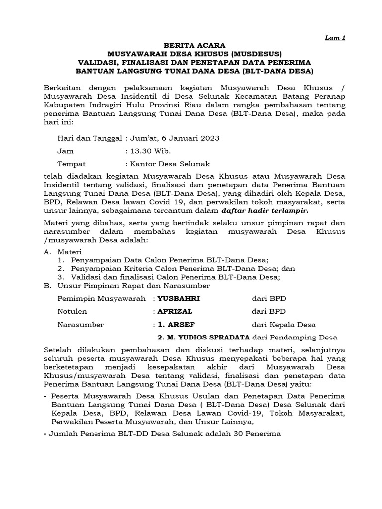 1. Penjaringan Data Penerima BLT DD Desa Selunak;