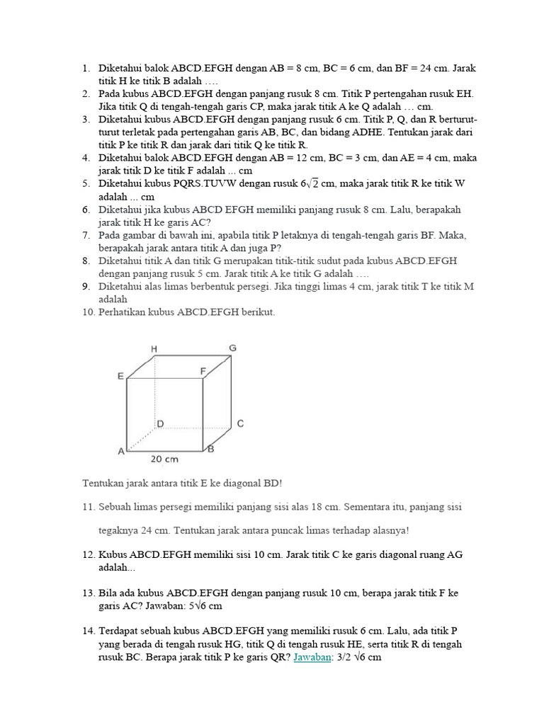 13. Bila ada kubus ABCD.EFGH dengan panjang rusuk 10 cm, berapa jarak titik F ke