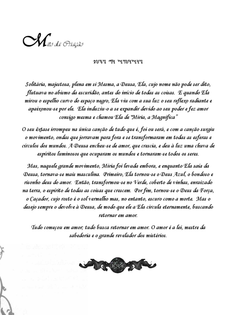 Solitária, majestosa, plena em si Mesma, a Deusa, Ela, cujo nome não pode ser dito, flutuava no abismo da escuridão, antes do início de todas as coisas. E quando Ela mirou o espelho curvo do espaço negro, Ela viu com a sua luz o seu reflexo radiante e apaixonou-se por ele. Ela induziu-o a se expandir devido ao seu poder e fez amor consigo mesma e chamou Ela de "Miria, a Magnifica”