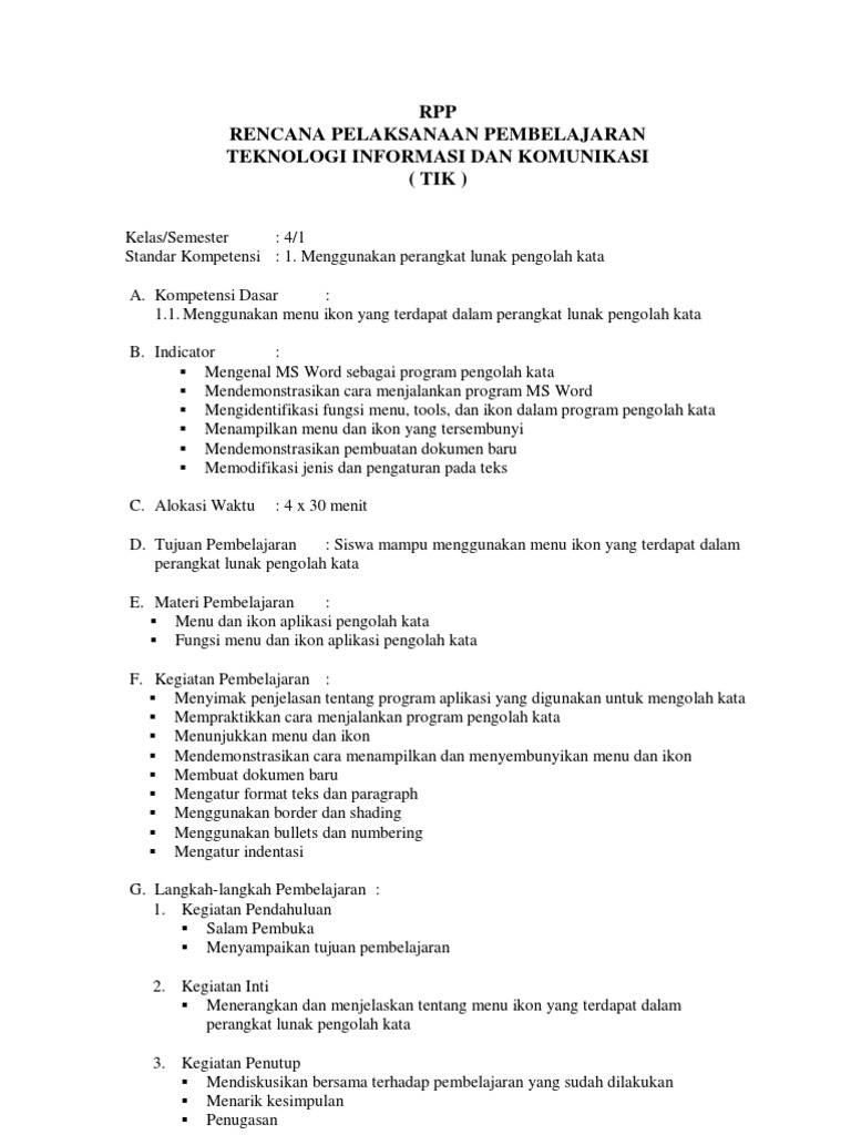 D. Tujuan Pembelajaran : Siswa mampu menggunakan menu ikon yang terdapat dalam perangkat lunak pengolah kata E. Materi Pembelajaran : Menu dan ikon aplikasi pengolah kata Fungsi menu dan ikon aplikasi pengolah kata F. Kegiatan Pembelajaran : Menyimak penjelasan tentang program aplikasi yang digunakan untuk mengolah kata Mempraktikkan cara menjalankan program pengolah kata Menunjukkan menu dan ikon Mendemonstrasikan cara menampilkan dan menyembunyikan menu dan ikon Membuat dokumen baru Mengatur format teks dan paragraph Menggunakan border dan shading Menggunakan bullets dan numbering Mengatur indentasi G. Langkah-langkah Pembelajaran : 1. Kegiatan Pendahuluan Salam Pembuka Menyampaikan tujuan pembelajaran 2. Kegiatan Inti Menerangkan dan menjelaskan tentang menu ikon yang terdapat dalam perangkat lunak pengolah kata 3. Kegiatan Penutup Mendiskusikan bersama terhadap pembelajaran yang sudah dilakukan Menarik kesimpulan Penugasan