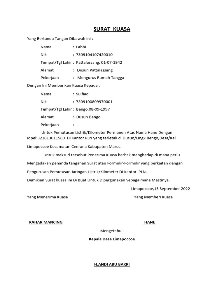 Demikian Surat kuasa ini Di Buat dan diberikan kepada yang bersangkutan Untuk