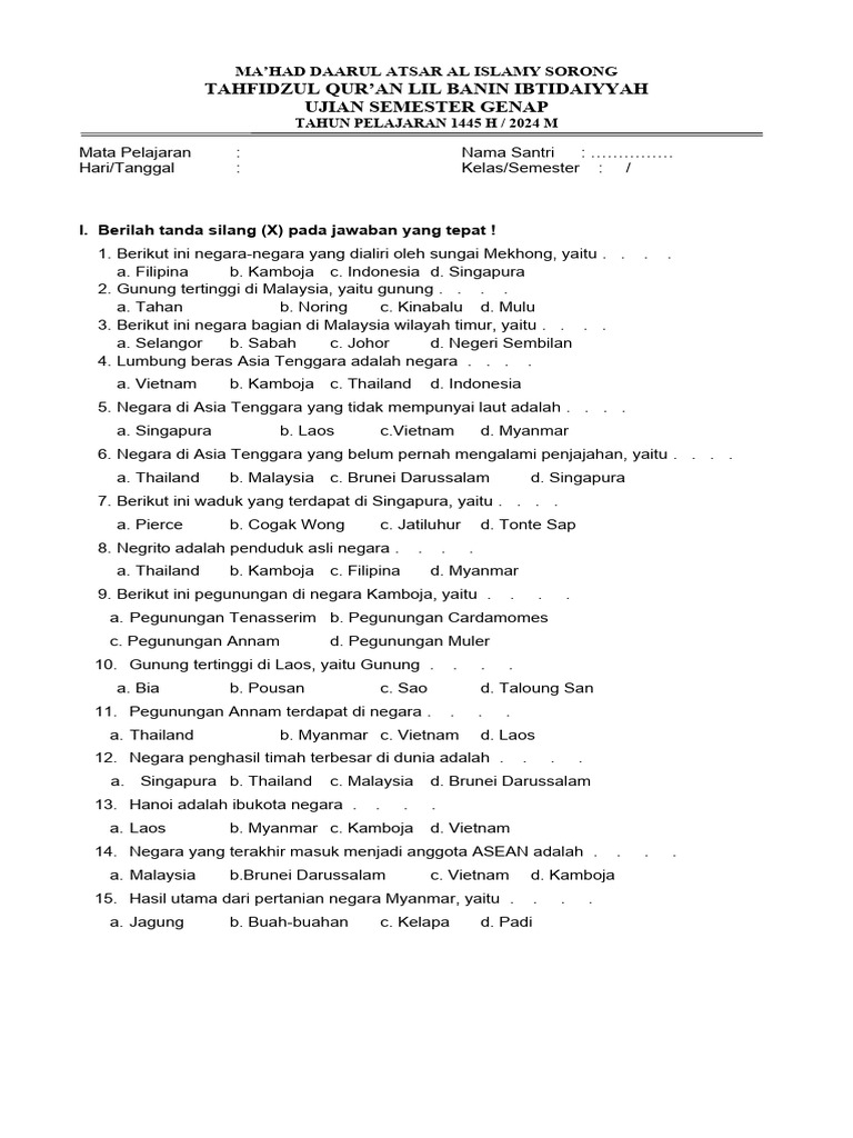I. Berilah tanda silang (X) pada jawaban yang tepat !
