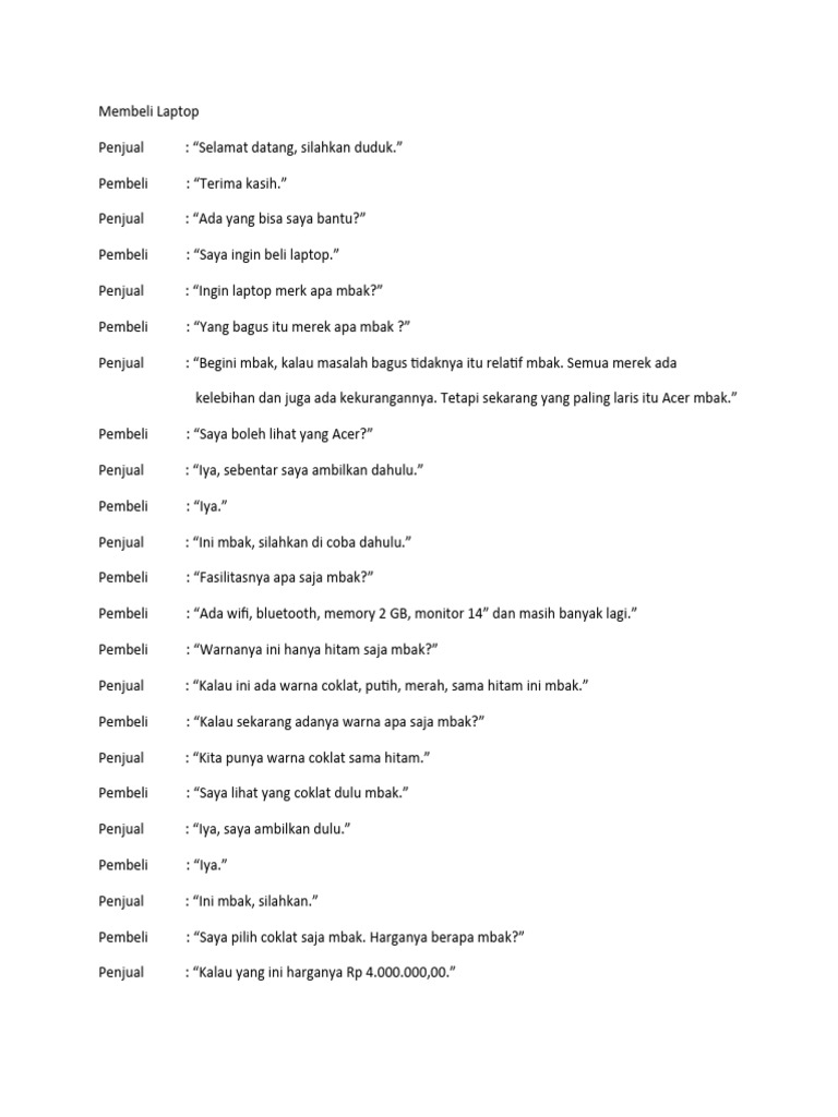 Pembeli : “Ada wifi, bluetooth, memory 2 GB, monitor 14” dan masih banyak lagi.”