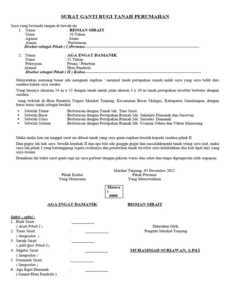 saya lah pihak I yang bertanggung segala resikonya dan pembelian tanah tersebut saya kembalikan dua kali lipat dari yang