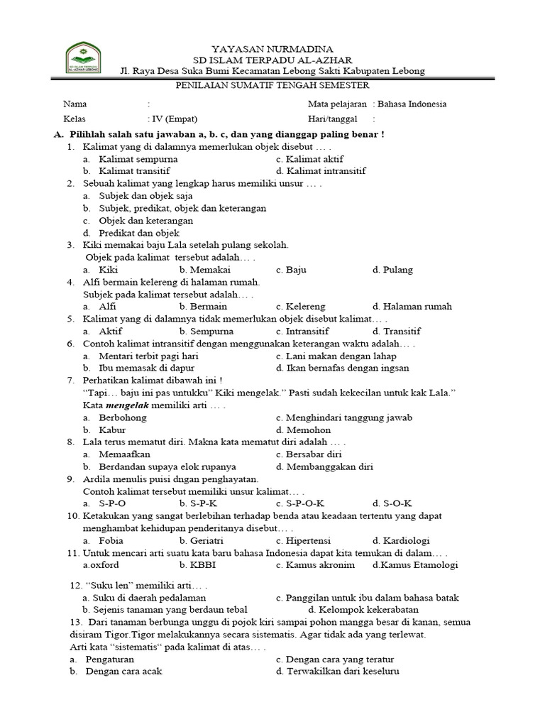 a. Aktif b. Sempurna c. Intransitif d. Transitif