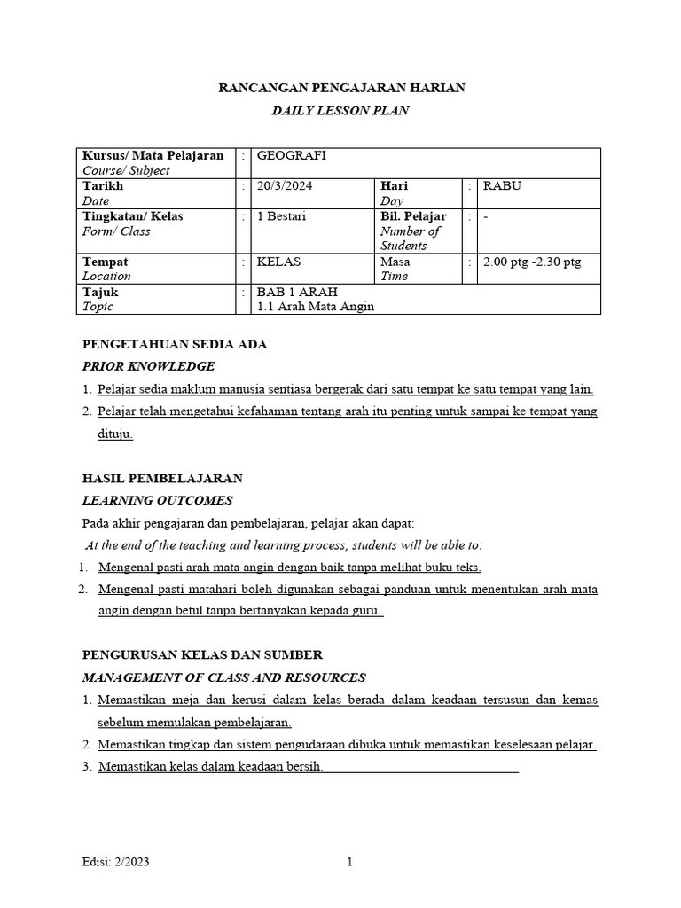 Tingkatan/ Kelas : 1 Bestari Bil. Pelajar : -