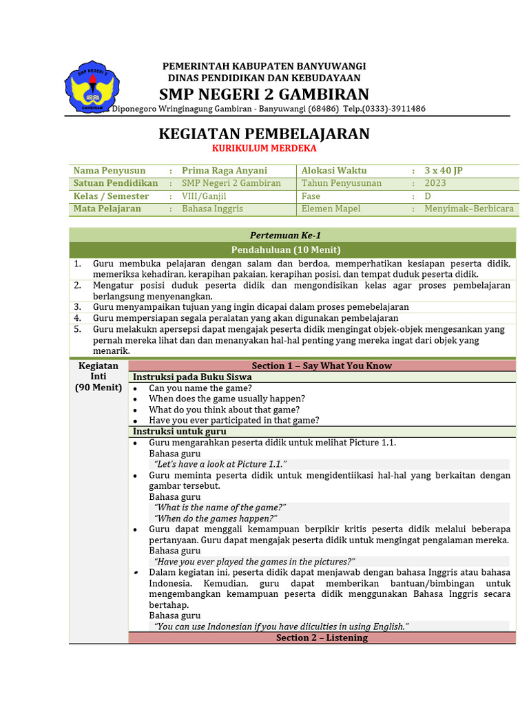 Satuan Pendidikan : SMP Negeri 2 Gambiran Tahun Penyusunan : 2023