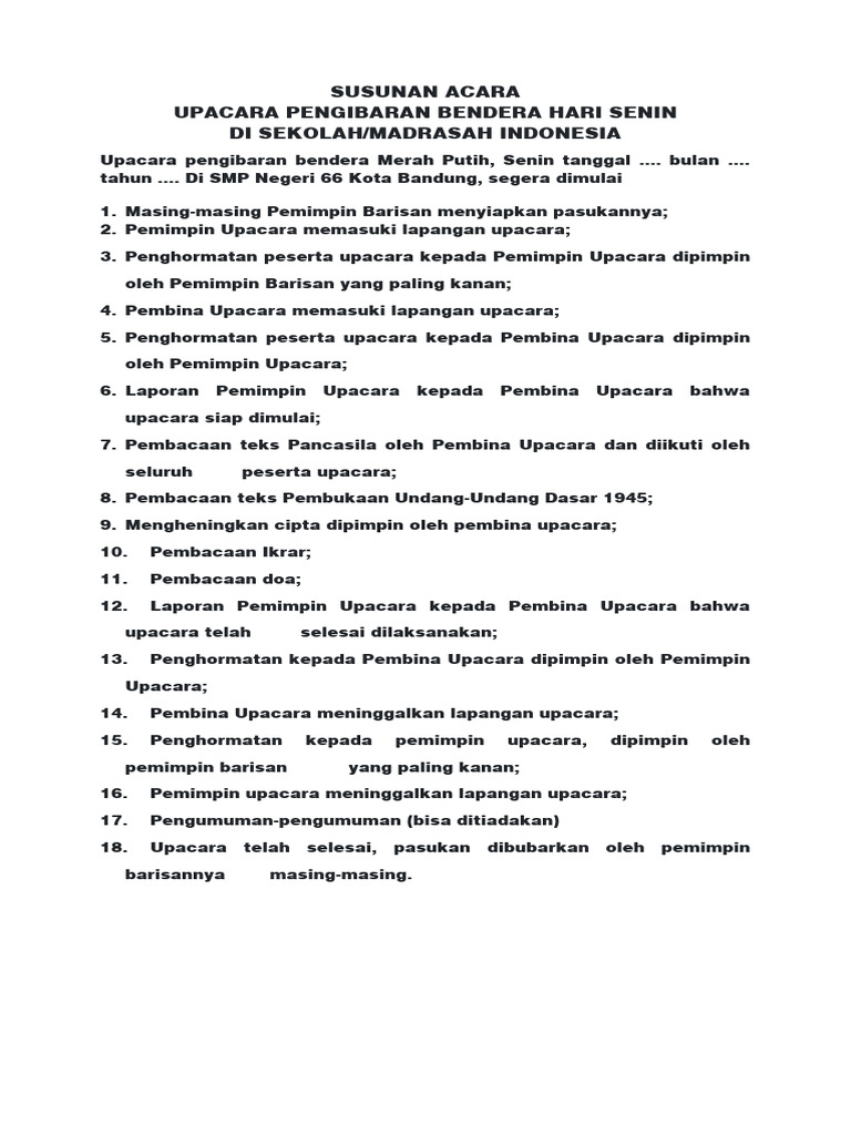 Upacara pengibaran bendera Merah Putih, Senin tanggal …. bulan ….