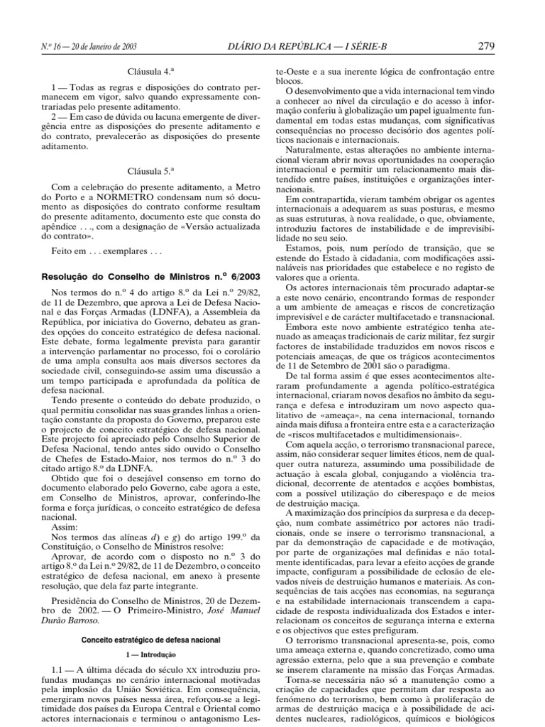 1 Todas as regras e disposies do contrato permanecem em vigor, salvo quando expressamente contrariadas pelo presente aditamento. 2 Em caso de dvida ou lacuna emergente de divergncia entre as disposies do presente aditamento e do contrato, prevalecero as disposies do presente aditamento. Clusula 5.a Com a celebrao do presente aditamento, a Metro do Porto e a NORMETRO condensam num s documento as disposies do contrato conforme resultam do presente aditamento, documento este que consta do apndice . . ., com a designao de Verso actualizada do contrato. Feito em . . . exemplares . . . Resoluo do Conselho de Ministros n.o 6/2003 Nos termos do n.o 4 do artigo 8.o da Lei n.o 29/82, de 11 de Dezembro, que aprova a Lei de Defesa Nacional e das Foras Armadas (LDNFA), a Assembleia da Repblica, por iniciativa do Governo, debateu as grandes opes do conceito estratgico de defesa nacional. Este debate, forma legalmente prevista para garantir a interveno parlamentar no processo, foi o corolrio de uma ampla consulta aos mais diversos sectores da sociedade civil, conseguindo-se assim uma discusso a um tempo participada e aprofundada da poltica de defesa nacional. Tendo presente o contedo do debate produzido, o qual permitiu consolidar nas suas grandes linhas a orientao constante da proposta do Governo, preparou este o projecto de conceito estratgico de defesa nacional. Este projecto foi apreciado pelo Conselho Superior de Defesa Nacional, tendo antes sido ouvido o Conselho de Chefes de Estado-Maior, nos termos do n.o 3 do citado artigo 8.o da LDNFA. Obtido que foi o desejvel consenso em torno do documento elaborado pelo Governo, cabe agora a este, em Conselho de Ministros, aprovar, conferindo-lhe forma e fora jurdicas, o conceito estratgico de defesa nacional. Assim: Nos termos das alneas d) e g) do artigo 199.o da Constituio, o Conselho de Ministros resolve: Aprovar, de acordo com o disposto no n.o 3 do artigo 8.o da Lei n.o 29/82, de 11 de Dezembro, o conceito estratgico de defesa nacional, em anexo presente resoluo, que dela faz parte integrante. Presidncia do Conselho de Ministros, 20 de Dezembro de 2002. O Primeiro-Ministro, Jos Manuel Duro Barroso.