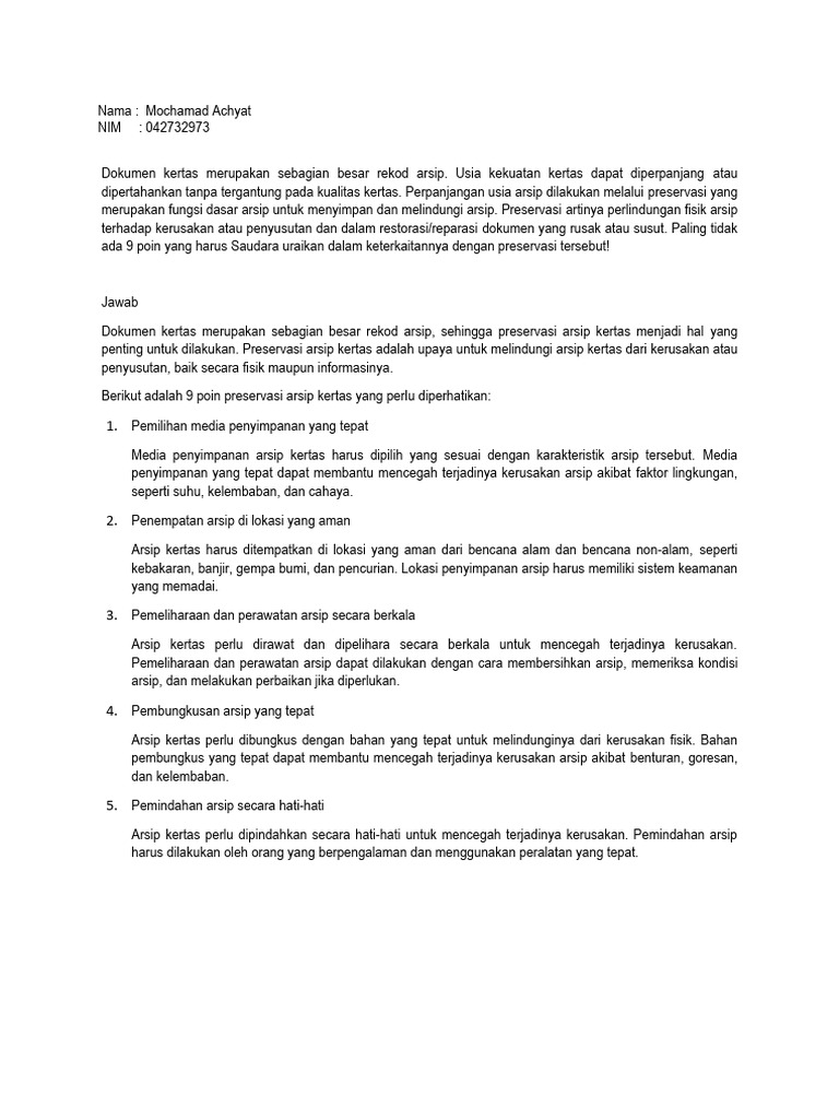 penting untuk dilakukan. Preservasi arsip kertas adalah upaya untuk melindungi arsip kertas dari kerusakan atau